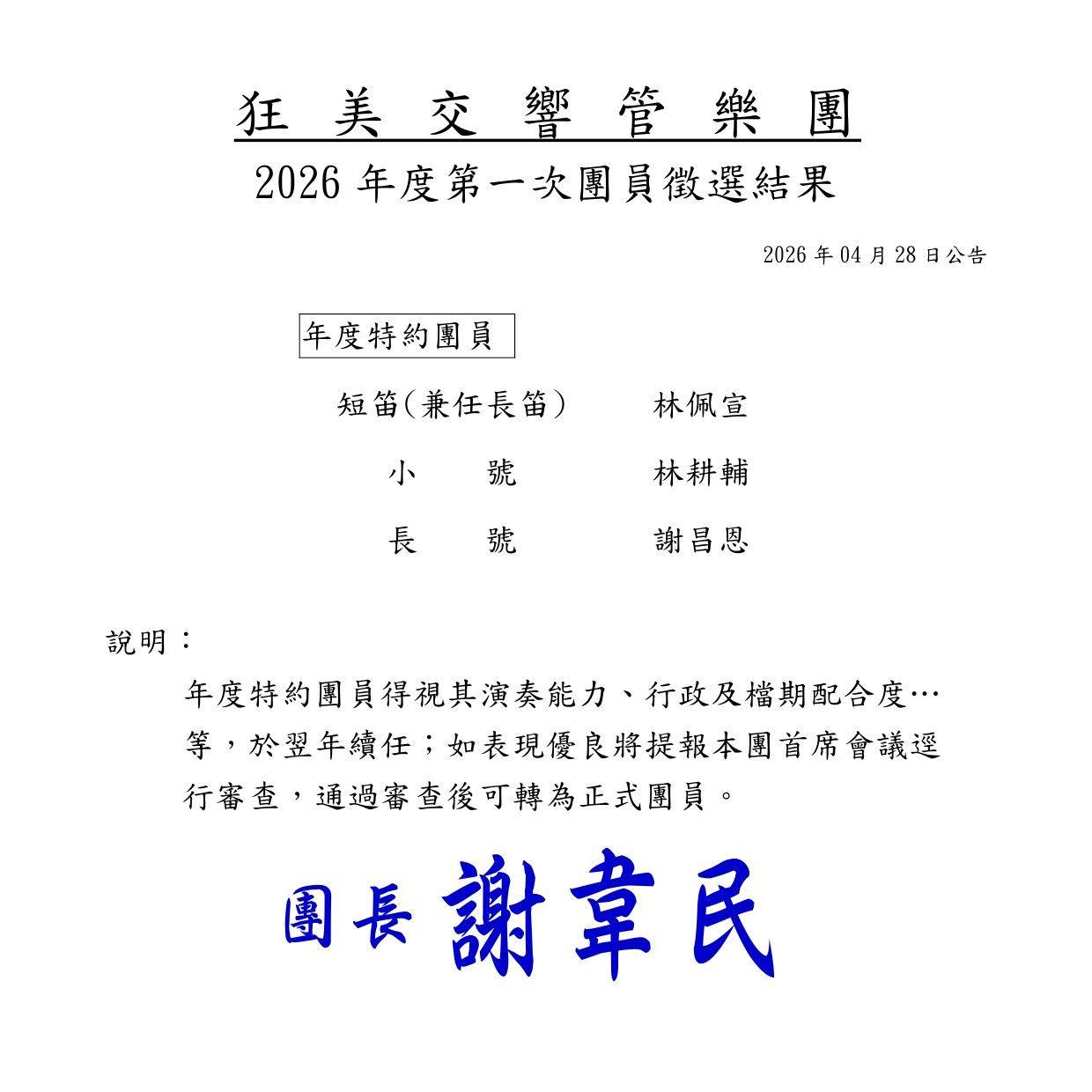 [公告] 狂美2026年度第一次團員徵選結果公告